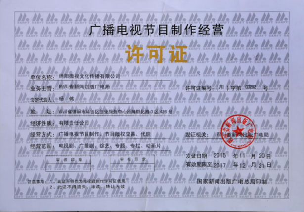 2014年2月在綿陽市科創園區成立綿陽微視文化傳播有限公司,同年3月與綿陽市科創園區工商局合作拍攝公益微電影《情人的投訴》被各大媒體推薦,獲得周點擊超500萬的好成績,并獲得2015年綿陽市優秀文藝項目扶持政策,同時《中國工商報》連續兩期報道,后繼續合作拍攝系列微電影《嘻哈工商之女子工商所》獲得國內各大電視臺及媒體報道播放。