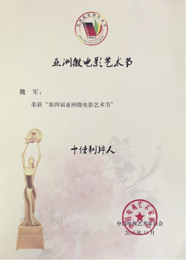 2016年 榮獲第四屆亞洲微電影藝術節“十佳制片人”稱號。
