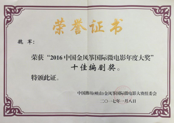 2016年 榮獲中國金風箏國際微電影年度大獎“最佳編劇獎”。